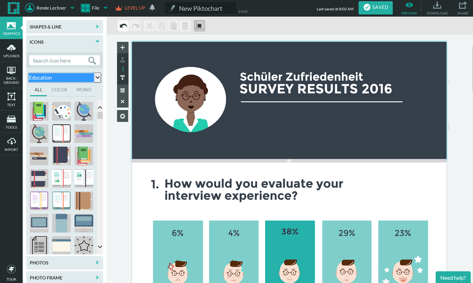 Auf der linken Seite haben Sie Zugriff auf alle Formen und Grafiken. Fügen Sie Elemente zum Startbildschirm Ihrer Präsentation per Drag and Drop hinzu. Über den Menüpunkt „File“ können Sie die Infografik speichern oder als Bild herunterladen. Der Dienst ist gratis, für Zusatzfunktionen und z.B. hohe Auflösung der Bilder muss die Pro-Version gekauft werden, welche entweder 15 oder 29$ im Monat kostet. Für einfache Grafiken genügt aber die Gratisversion.