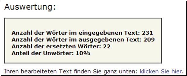 die Anzahl Zeichen und Wörter und einen Füllwort- bzw. „Bullshit“-Index. Möglich für deutsche, englische und spanische