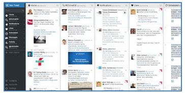 Tweetdeck ist ein kostenloses Tool für die Selbstorganisation. Spalten erhöhen die Übersicht. Hier wird die Timeline angezeigt, hier ist Platz für Benachrichtigungen, Erwähnungen, Favoriten, Listen, Trends oder für die Ergebnisse von Suchanfragen. Ein kleines Symbol in der rechten oberen Spalte öffnet die Filter, die sich auch kombinieren lassen. Mit Tweetdeck kann man Tweets auch timen. Tweetdeck kann seit kurzem nur noch browserbasiert genutzt werden.